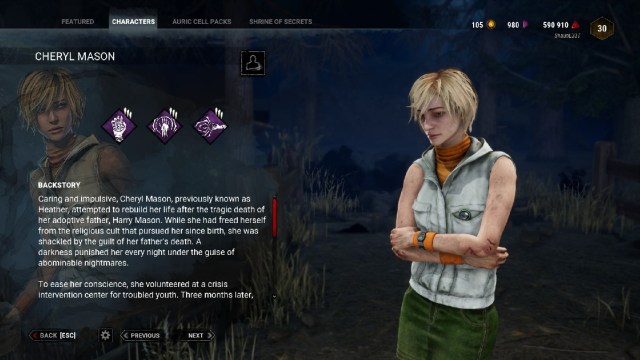 Cheryl Mason is a tortured soul, so maybe that’s why she doesn’t seem to give much thought to a wound that would normally cause someone to succumb to death. She’s easily one of the best quiet Survivors to play as if you’re hoping to keep the Stealthy approach, even taking on killers like Pyramid Head without much hesitation or noise.