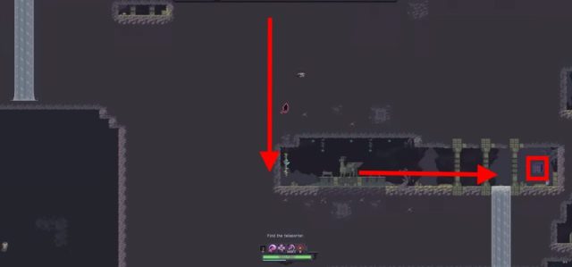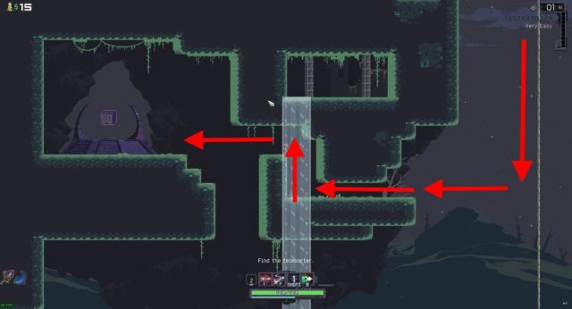 On two variants of the Desolate Forest stage, using a movement ability or movement item will be important to reach the artifact. Climb down the middle rope to get to the bottom level. While climbing you’ll notice a platform and a waterfall on the far left.