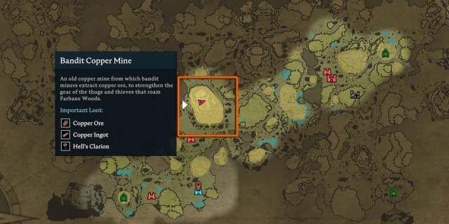 The Bandit Copper mine is a landmark in Farbane Woods, just southwest of the Forgotten Cemetery and southeast of the Bandit Armory.