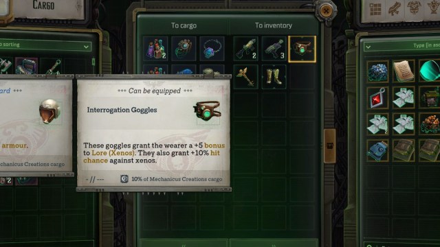 - Interrogation Goggles – These goggles grant the wearer a +5 bonus to Lore (Xenos. They also grant +10% hit chance against Xenos.