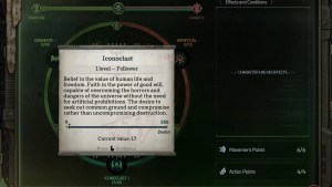 Iconoclast is one of the three major alignments in Warhammer 40K: Rogue Trader, next to Heretical and Dogmatic. Each of these alignments coincides with a particular way of thinking and can provide a range of bonuses when your character focuses on that thought line. Iconoclast represents the value of human life and freedom and the desire to compromise with those you encounter rather than utterly obliterate them. If you want to see how you’re progressing in alignments yourself, you’ll want to check the Character menu.