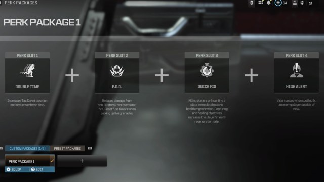 Perk Slot 1 and Perk Slot 2 share the same options in the Perk Package and these seem to be the easiest to choose from. It’s hard to beat Double Time due to the increased Tac Sprint duration and refresh. Then EOD protects us from explosive damage. I can tell you from experience that players are going to be spamming explosives where they can.