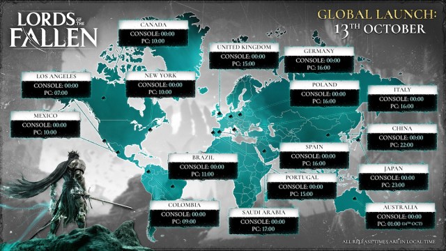 As you can see, all consoles will release at midnight globally.. However, the times for the PC release vary significantly, with Australia’s release bleeding over into October 14, 2023. If you plan on playing Lords of the Fallen on console, you can get ahead of the crowd by preloading it in advance. Sadly, PC players do not have this option and will have to wait until launch to download and play.