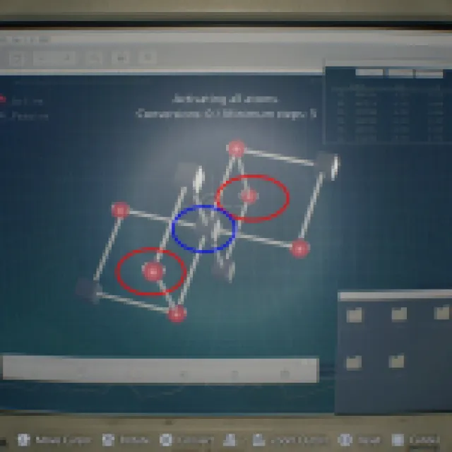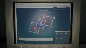 When you reach the laser microscope, analyze the Severed Hand, and you’ll have to play the minigame where you need to activate all atoms. You only have three steps. Select the two atoms circled in red in the image above. Next, select the atom in the middle, circled in blue.