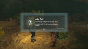 As mentioned previously, Fera will reward you 10 rupees for every well you uncover, making your total earnings 580 rupees. After telling her about all the wells, she’ll also give you the All’s Well, which is a model of a well. While the item doesn’t appear to do anything, it’s still a nice surprise to get.