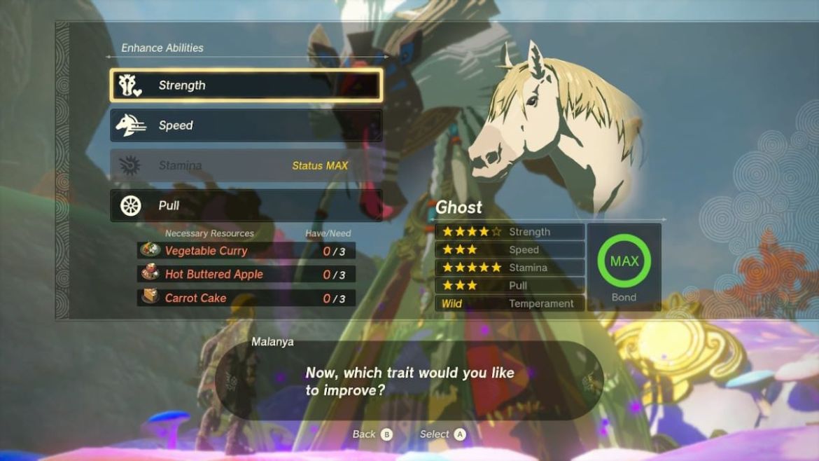 Horse enhancements are a new feature and can increase a horse’s strength, speed, stamina, or pull by one star. However, special horses, like Ganondorf’s horse, cannot be upgraded. If you try, Malanya will tell you to respect its feelings. We love a horse ally.