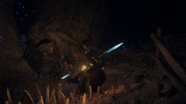 When you enter the cave where the Goreminotaur is hiding, you’ll want to ensure that you’ve got your Lantern on. The Goreminotaur is covered in near-pitch black skin and a mop of fur that makes it difficult to spot. You’ll almost immediately notice the beast’s horrifying bright-red eyes peering at you in the darkness, and a health bar will spring onto the screen.