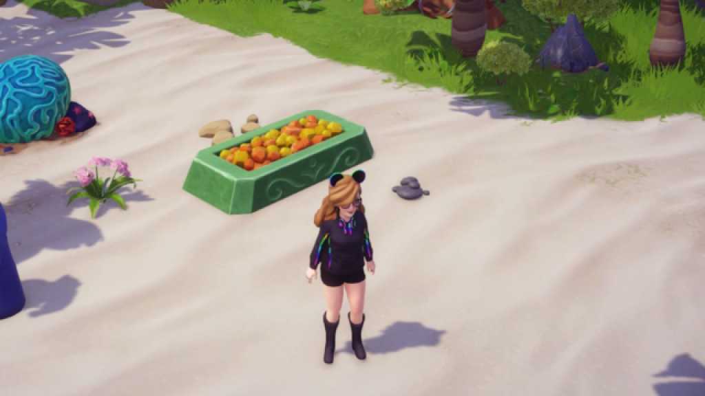 Olaf’s Parasol is located in Dazzle Beach. There is a plot twist, though. Since the Fairy Godmother’s enchantments are acting up, you won’t spot it as an umbrella. Instead, you’ll find a stone container full of orange and yellow rocks. Its spawn location is random, but it will appear somewhere on the beach. I found mine along the sand, but there are instances where it can spawn in the grass.