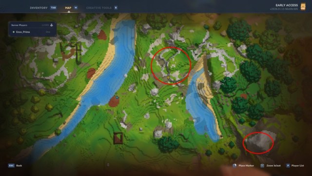 First, you’ll need to find Copper Ores to turn them into Copper Ingots. Copper Ores are usually found in the mountainous areas. Since worlds are procedurally-generated, you just open the map and look for the rocky terrain and go to them, as seen in the image above.