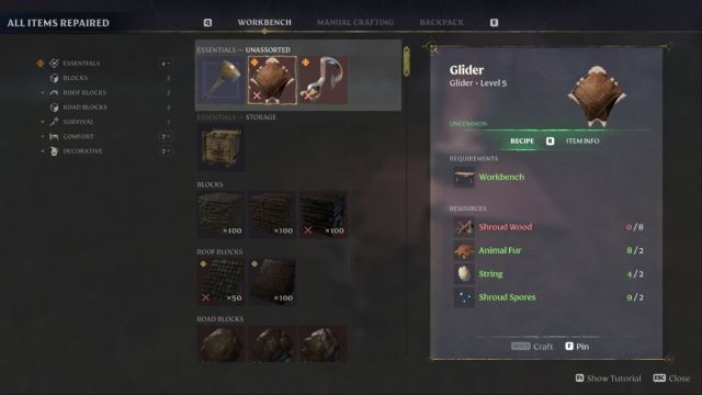 Since the world of Enshrouded is quite large, having an easy way to make it around without worrying about fall damage is vital. The Glider can be crafted at a workbench and requires the following materials.