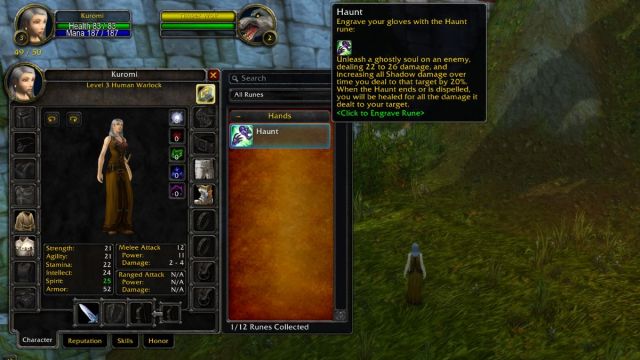 After learning Haunt, open up the Character menu (press the C key) and click on Runes in the top-right. Select Haunt, and then click on your gloves to engrave the spell into them. You can now use Haunt in combat, which costs 12 Mana to cast and has a 30-yard range and a 12-second cooldown.
